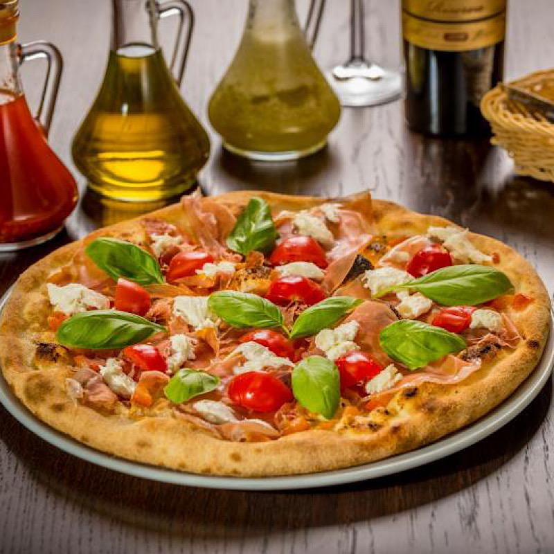 Sos śmietanowy z serem grana padano , po wypieczenia na pizzę kładziemy świeżą szynkę crudo di parma , mozzarella Fior di latte , pomidorki koktajlowe i świeżą bazylię