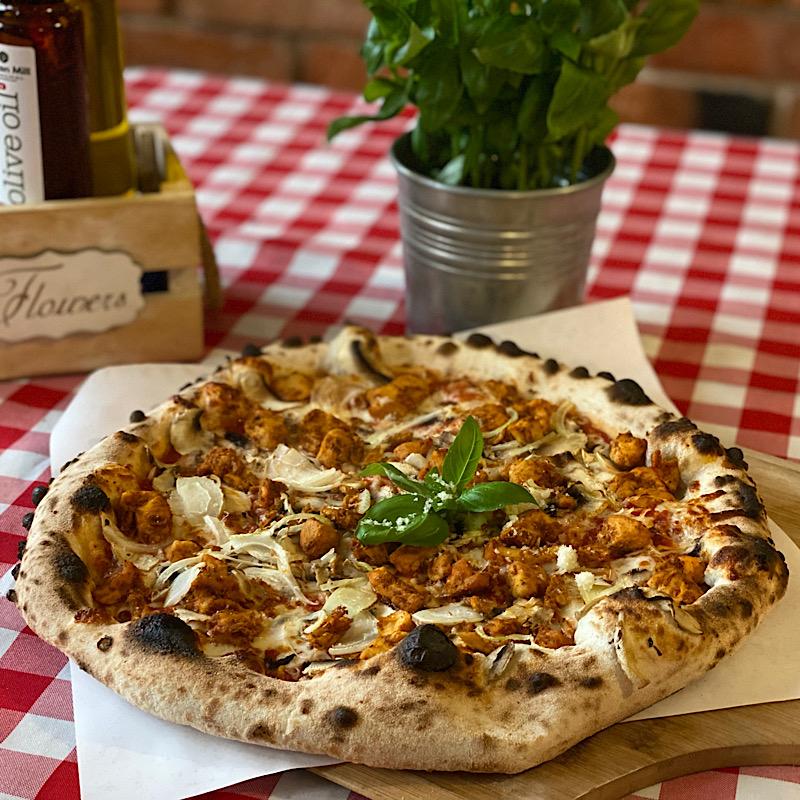 Sos z pomidorów pelati , mozzarella ,kurczak pieczony, pieczarki, cebula